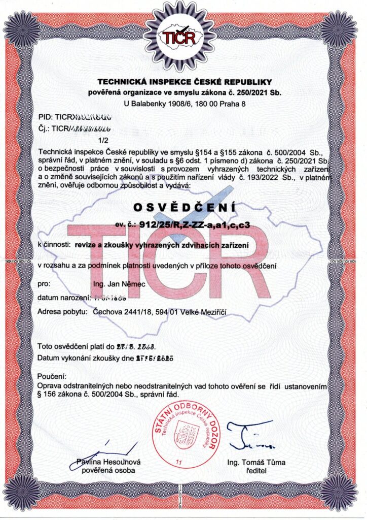 Poskytuje odborné revize a zkoušky vyhrazených zdvihacích zařízení podle zákona č. 250/2021 Sb. Naše služby zajišťuje autorizovaný revizní technik s oprávněním vydaným Technickou inspekcí České republiky, evidenční číslo 912/25/R,Z-ZZ-a,a1,c,c3.